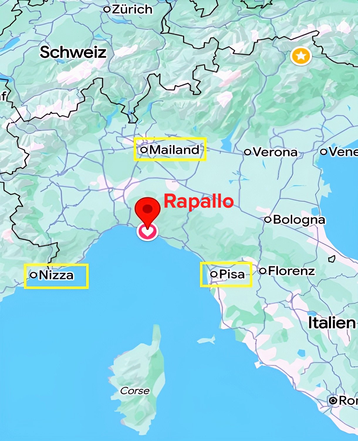 Rapallo is located in the middle of the triangle Nice (Monaco), Milan and Pisa, approx. 40 km southeast of Genoa.
